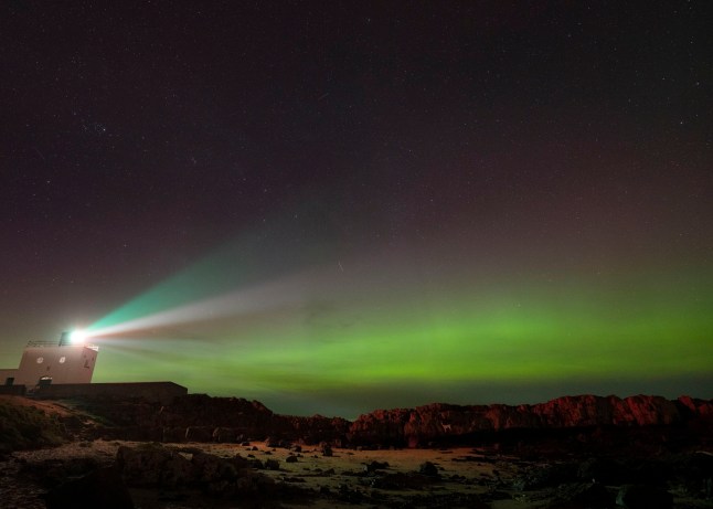 A meteor appears as the aurora borealis,commonly known as the Northern Lights,light up the skies above Bamburgh lighthouse in Northumberland during a G3 solar storm last night (Picture: Owen Humphreys/PA)