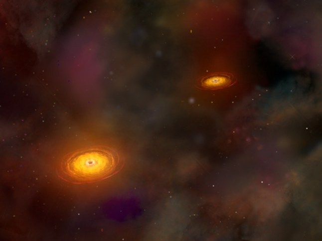 The first of a series of images which gives an artistic representation of the merger of two black holes,which orbit each other for hundreds of millions of years before colliding (Picture: NASA/CXC/A.Hobart/Cover Media)